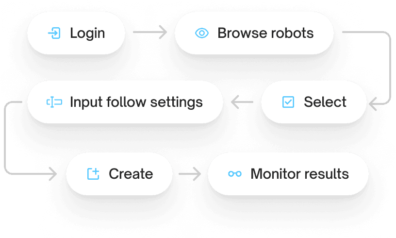 Condensed setup into a single linear flow: login → browse → select → set → create → track.