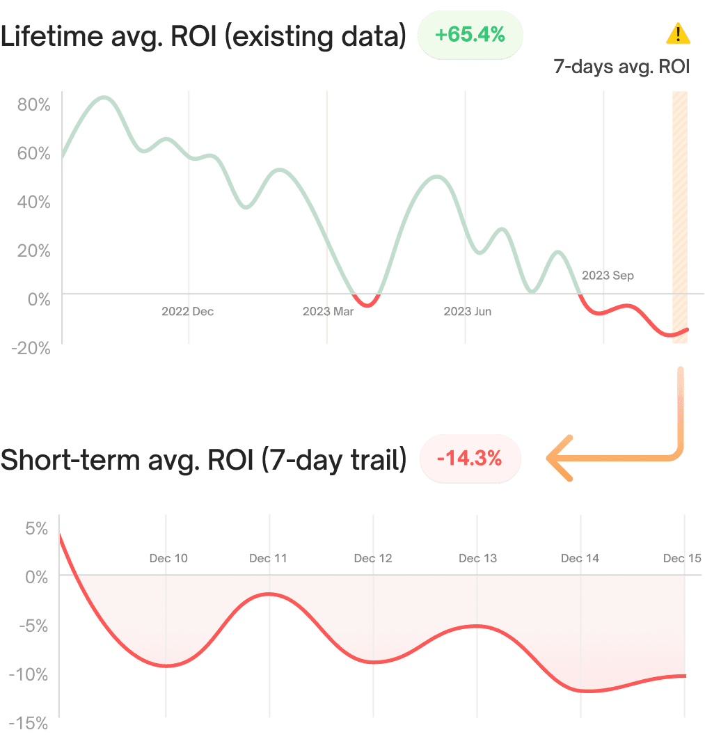 Lifetime ROI looks solid, but zooming into just 7 days uncovers a consistent drawdown.